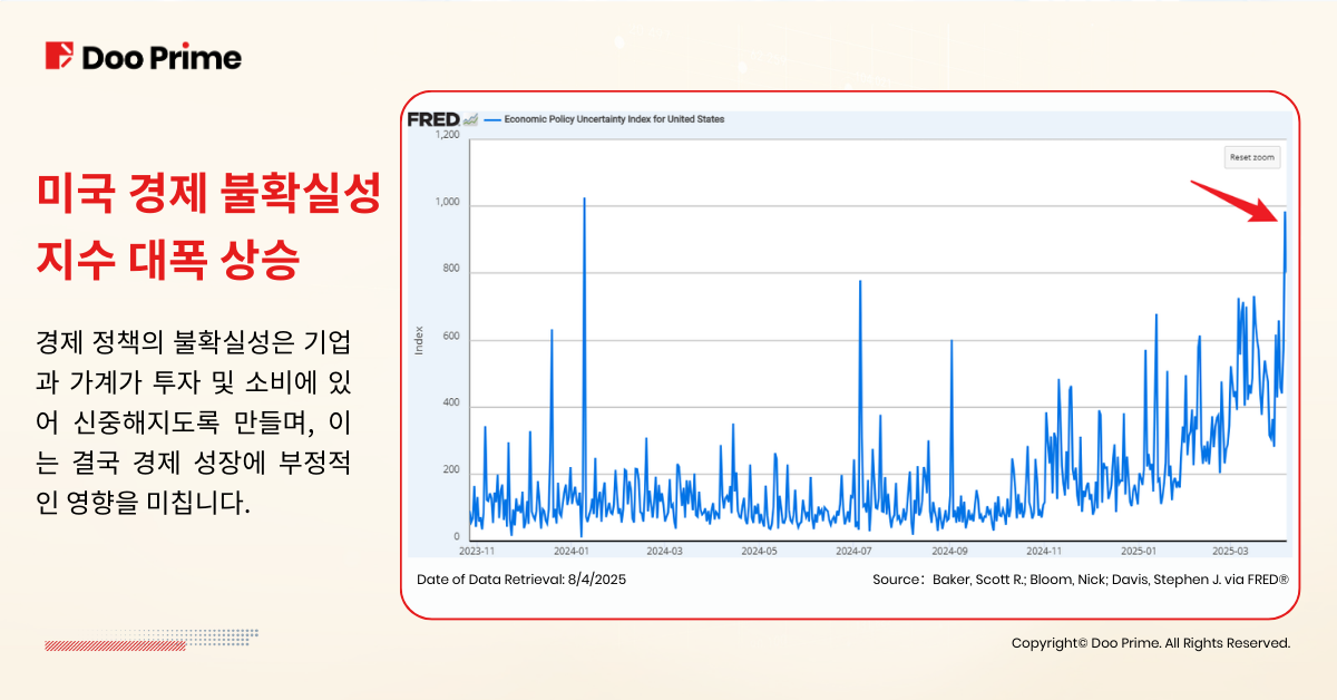 트럼프 관세 발표 이후, 미국 경제 정책의 불확실성 지수는 크게 상승했습니다. 일반적으로 기업들은 경제 정책이 불확실할 때 투자 결정을 미루거나 축소하는 경향이 있으며, 이에 따라 시장은 미국 경제가 올해 경기 침체에 빠질 가능성이 높다고 전망하고 있습니다.
