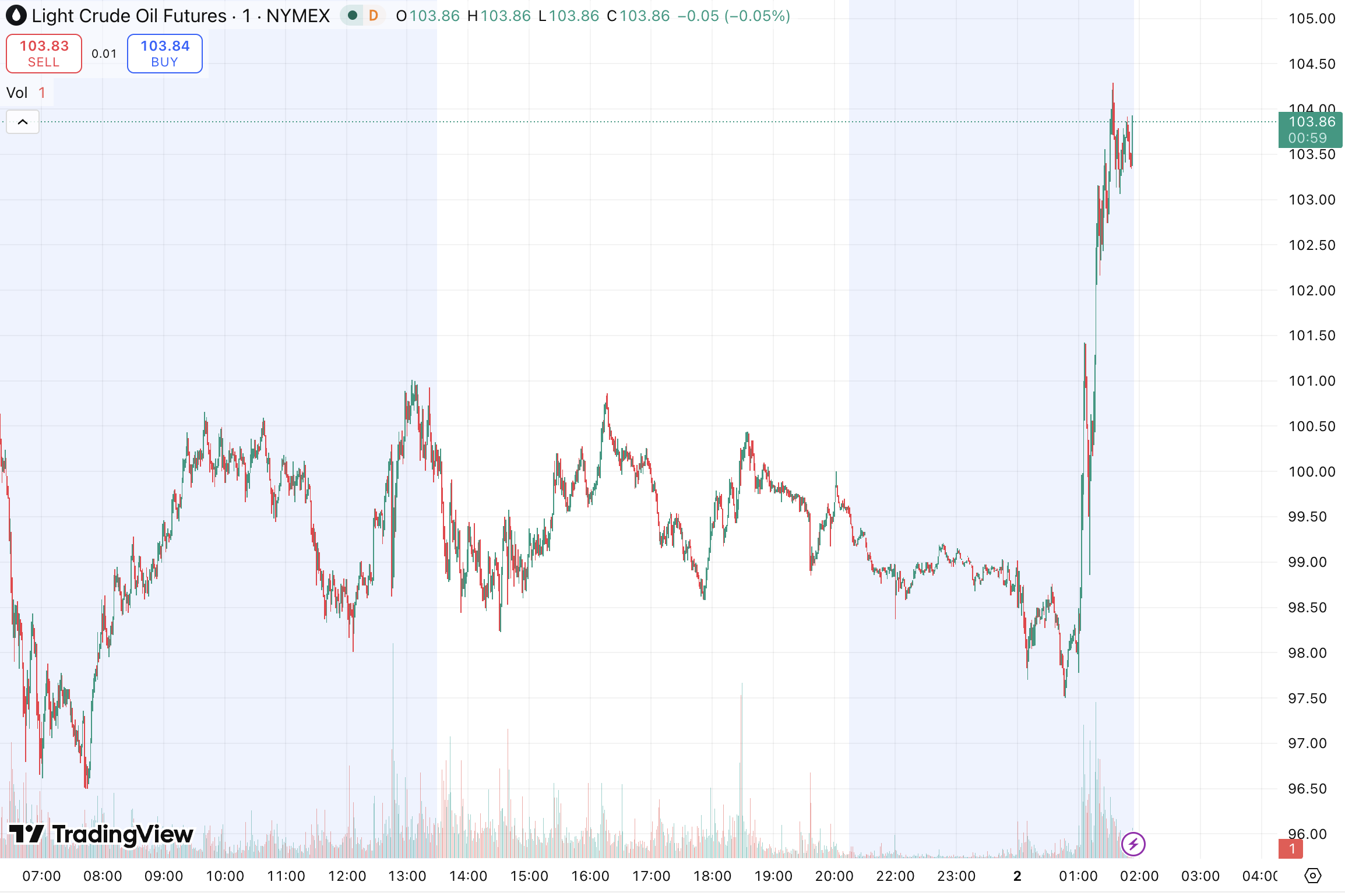 技术面上,日线级别油价整体仍处于高位整理区间,价格多次在 108 美元附近遇阻,显示上方抛压较重,而下方 100 美元构成关键支撑区域,体现多头防守意愿。动能指标显示上涨动能有所减弱,但尚未形成趋势性反转信号。 4 小时级别来看,短期走势呈现震荡偏弱结构,价格在区间内反复测试支撑与阻力,若有效跌破 100 美元,可能触发技术性止损盘并加速下行;反之,若地缘风险再度升级并推动价格突破 108 美元,则有望打开新的上行空间。
