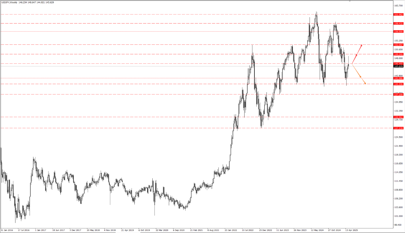 • 上周美元兑日元冲高回落至关键位置 146.44 一线下方,本周依旧关注周多空分届 146.44 一线;