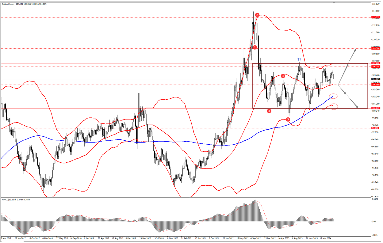 • 美指从五波下行结构完成后,形成了力度上升波段,随后美指受美联储降息窗口迟迟未能开启的影响,展开了中长期的横盘整理过程,震荡区间 100.61 到 107.20 区间,在区间内部关注周内多空分界 104.08 一线;