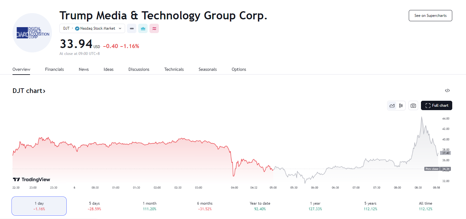 6 日,由于在选情极为胶着的美国总统大选中,初步出口民调似乎显示特朗普占据优势,特朗普媒体科技(DJT)虽然在 5 日收跌 1.16%,但在盘后交易中却大幅反弹了 10%,美元、10 年期债券收益率也在周三亚洲时段盘初大幅飙升。