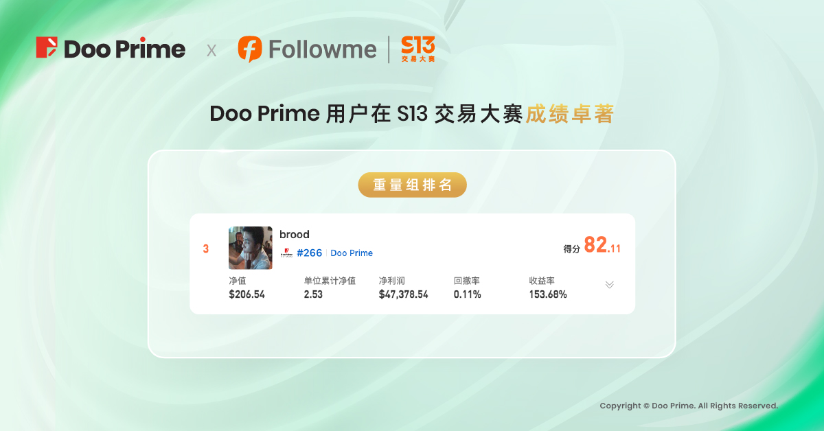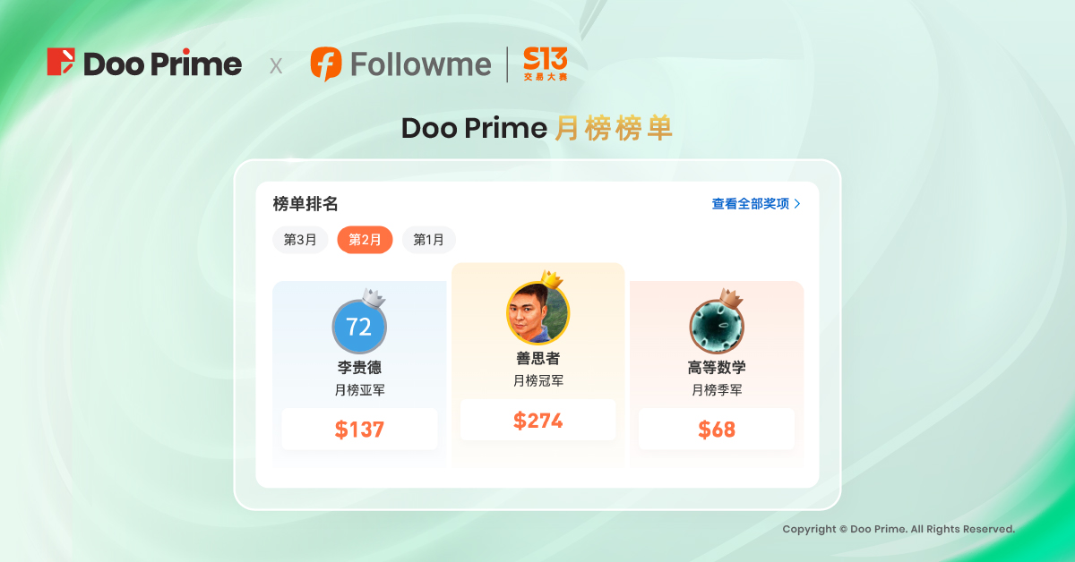 FOLLOWME S13 交易大赛收官,Doo Prime 选手喜赢新手组冠军!