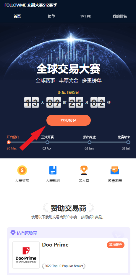 - Step 2 : 进入 FOLLOWME S12 交易大赛专题页面 https://www.followme.vip/contest/ 点击【立即参赛】;