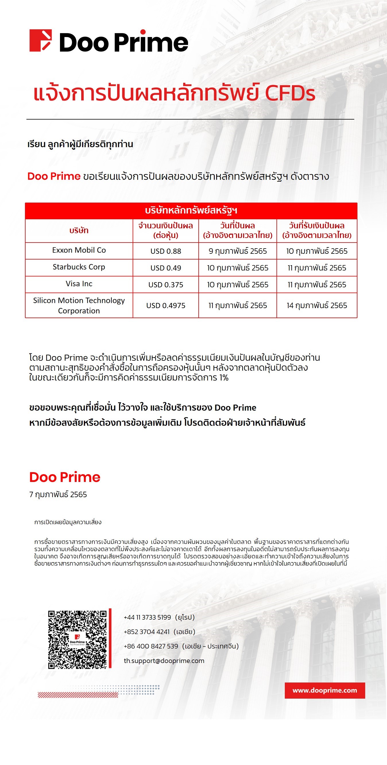 Doo Prime แจ้งการปันผลหลักทรัพย์ CFDs