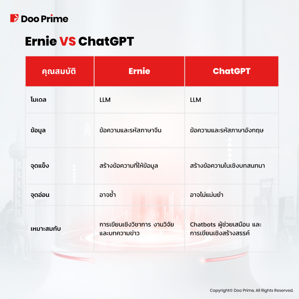 Ernie จาก Baidu เป็นคู่แข่งอีกบริษัทของ ChatGPT เมื่อเร็วๆ นี้ บริษัทได้ลงทุน 145 ล้านเหรียญสหรัฐในการวิจัยและพัฒนา AI การลงทุนครั้งนี้เป็นสัญญาณว่า Baidu จริงจังกับการแข่งขันในการแข่งขัน AI ด้วยศักยภาพที่สามารถก้าวหน้าไปข้างหน้า ภายในอีกไม่กี่ปีข้างหน้า