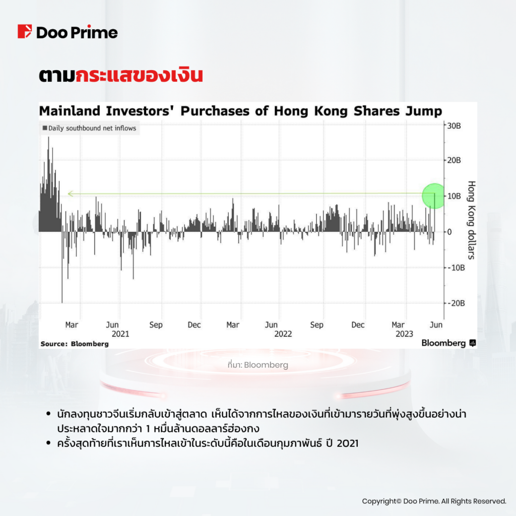 • นักลงทุนชาวจีนเริ่มกลับเข้าสู่ตลาด เห็นได้จากการไหลของเงินที่เข้ามารายวันที่พุ่งสูงขึ้นอย่างน่าประหลาดใจมากกว่า 1 หมื่นล้านดอลลาร์ฮ่องกง
