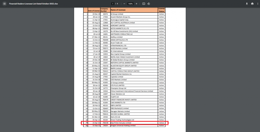Bước 5: Tên công ty “Doo Prime Vanuatu Limited” sẽ hiện lên trong danh sách, trong đó bao gồm mã số công ty cùng trạng thái giấy phép.
